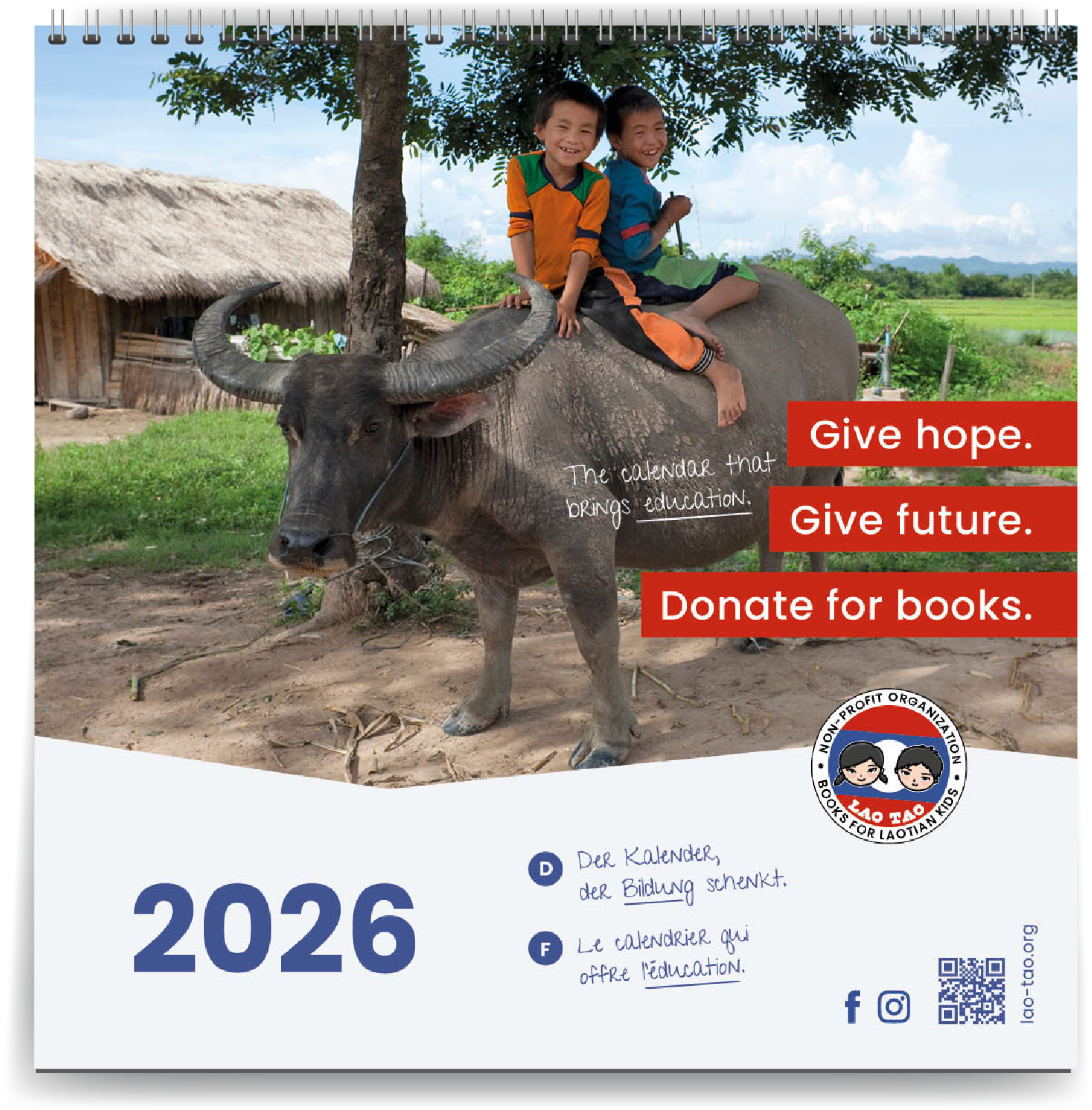 Unser Kalender 2026 widmet sich ganz den Kindern von Laos. Die Fotografien zeigen berührende Alltagsmomente, die uns in eine andere Welt versetzen: Kinder auf Wasserbüffeln, Mädchen an traditionellen Webstühlen, junge Novizen in buddhistischen Klöstern. Einfache Behausungen, bescheidene Verhältnisse – und doch begegnen uns strahlende Gesichter voller Würde und Gelassenheit.